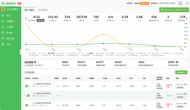 本公司的核心產品是一款自主研發全自動直通車優化軟件 —— 超級快車!以海量關鍵詞為基礎,自動查找高精準度詞相匹配,自動推 廣優化,并且運用6大優化策略適應不同流量供給,多方位滿足賣家千人千面的推廣需求!并且受到數以萬計的賣家高度好評,連續蟬聯淘 寶金牌服務商!